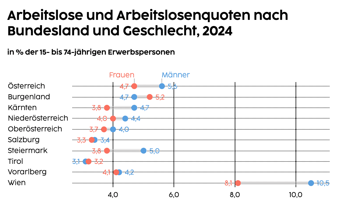 Laut Mikrozensus-Arbeitskräfteerhebung von Statistik Austria blieben 2024 trotz Rezession sowohl die Arbeitslosenquote mit 5,1 % als auch die Erwerbstätigenquote mit 74,8 % im Vergleich zum Vorjahr nahezu unverändert. Innerhalb der Wirtschaftsbereiche zeigte sich ein Beschäftigungswachstum im Dienstleistungssektor, während Industrie und Gewerbe erneut deutlich schrumpften.